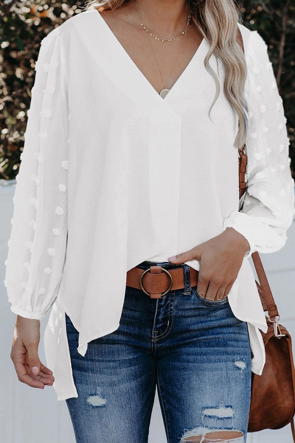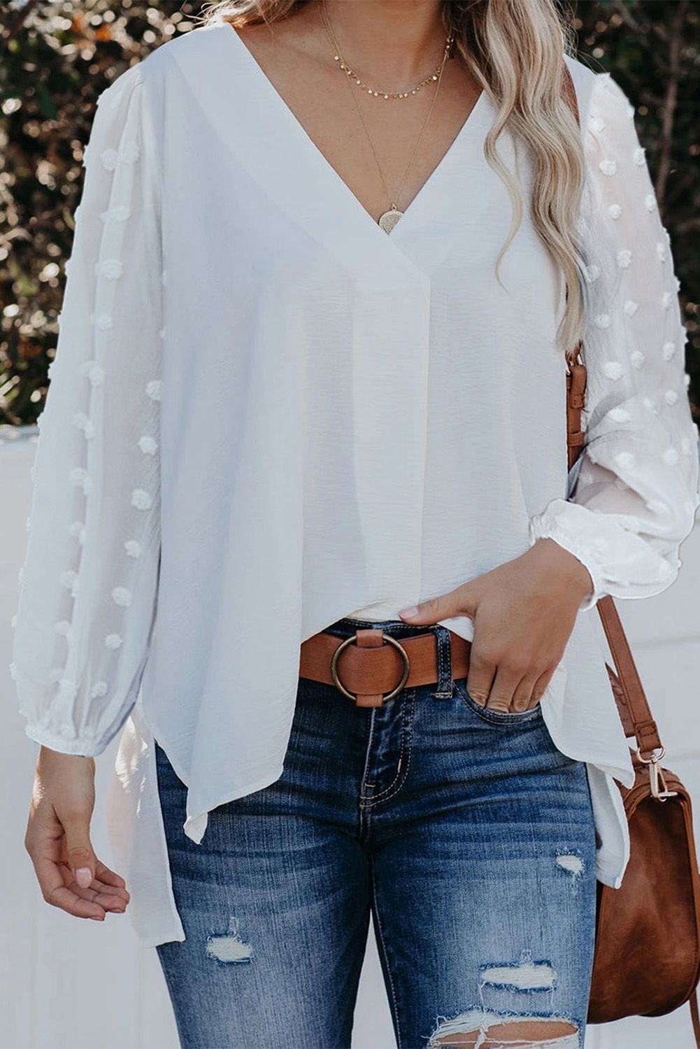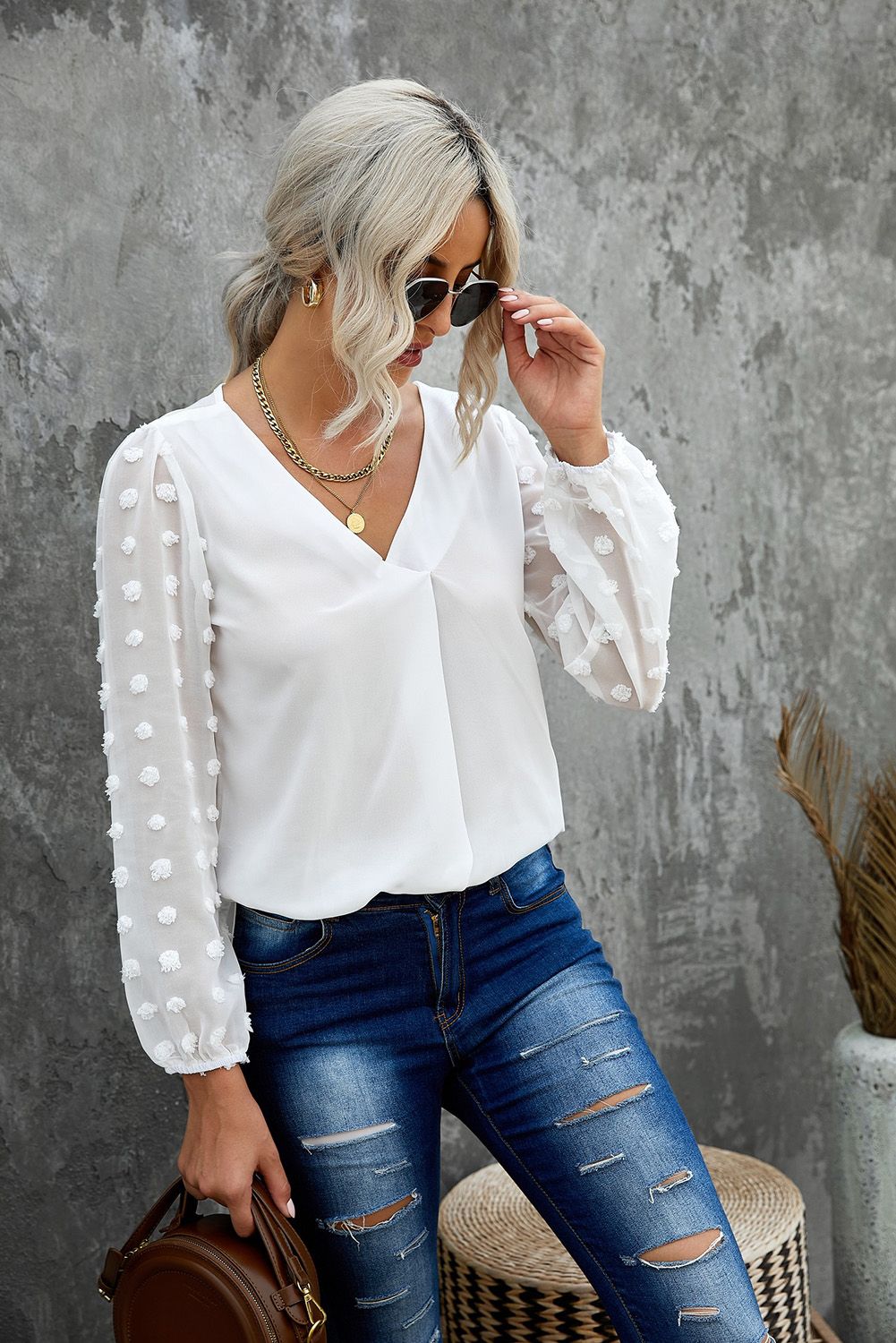 Black Swiss Dot V Neck Long Sleeve Blouse