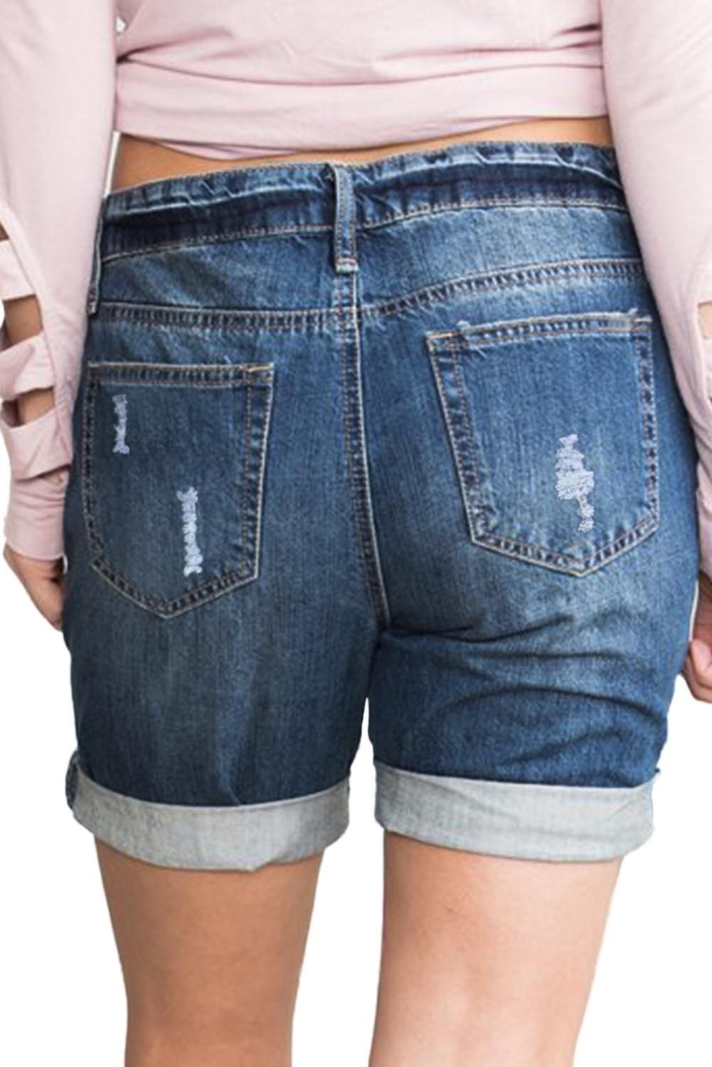 Five functional pockets Zipper and button closure Mid rise, relaxed fit, rolled cuffs Distressing detail is actual holes Denim shorts are spring transition staple womens denim shorts of the latest fashion boyfriend style