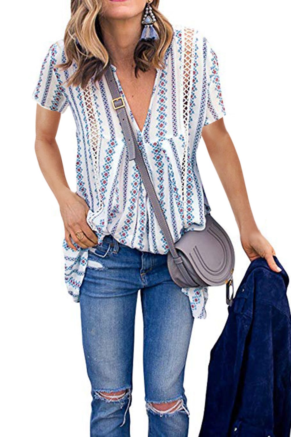 Blue Boho Floral Printed V Neck Short Sleeve Blouse