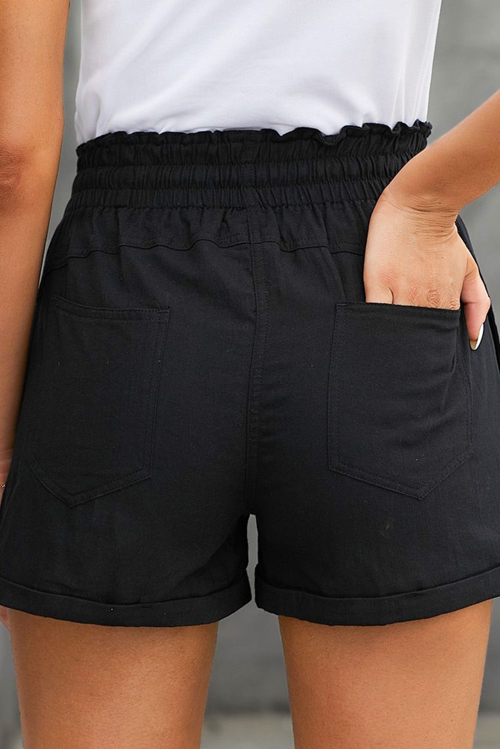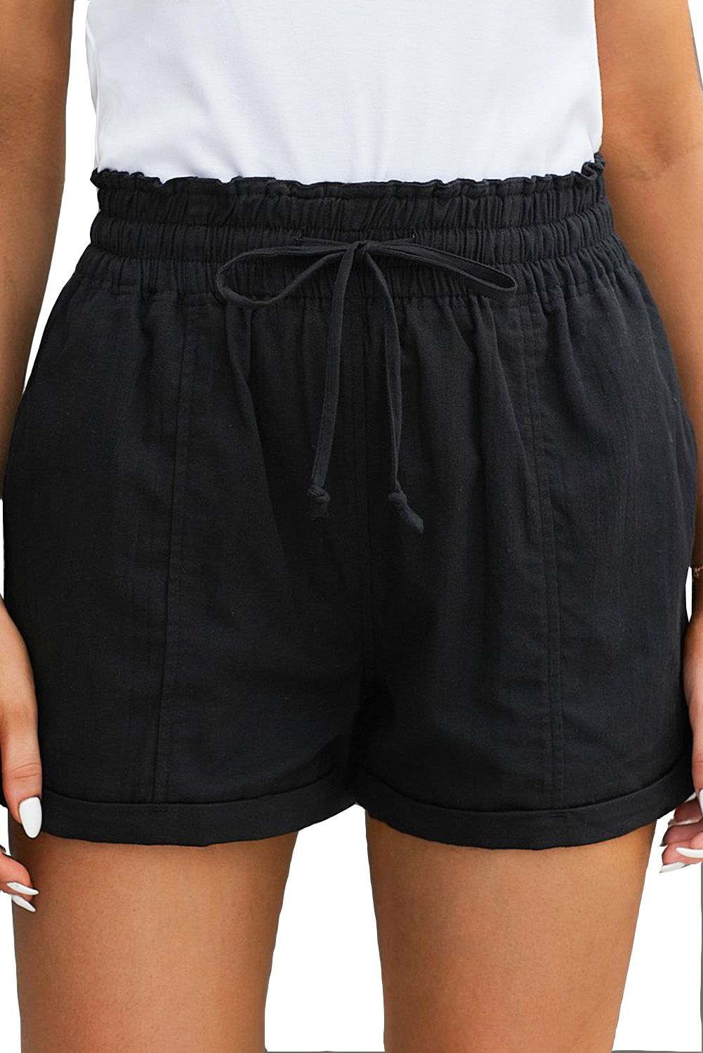 Black Elastic Waist Drawstring Roll Hem Shorts
