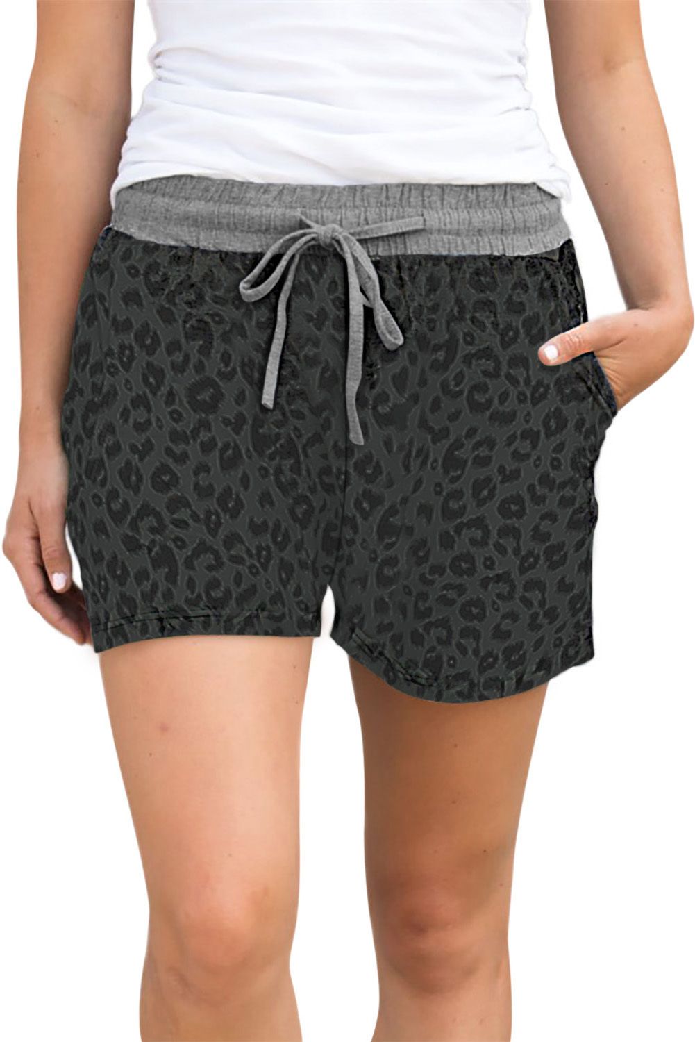 Gray Leopard Print Drawstring Waist Shorts