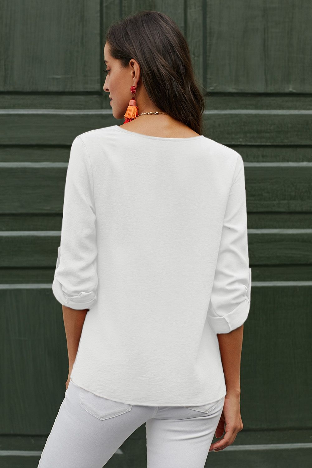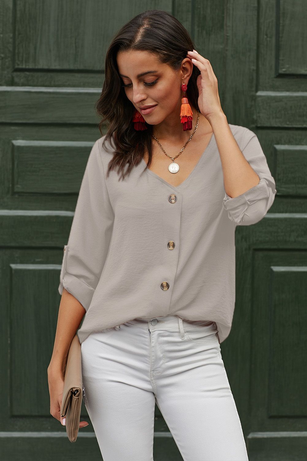 Sexy v neck, button detail, roll up sleeve