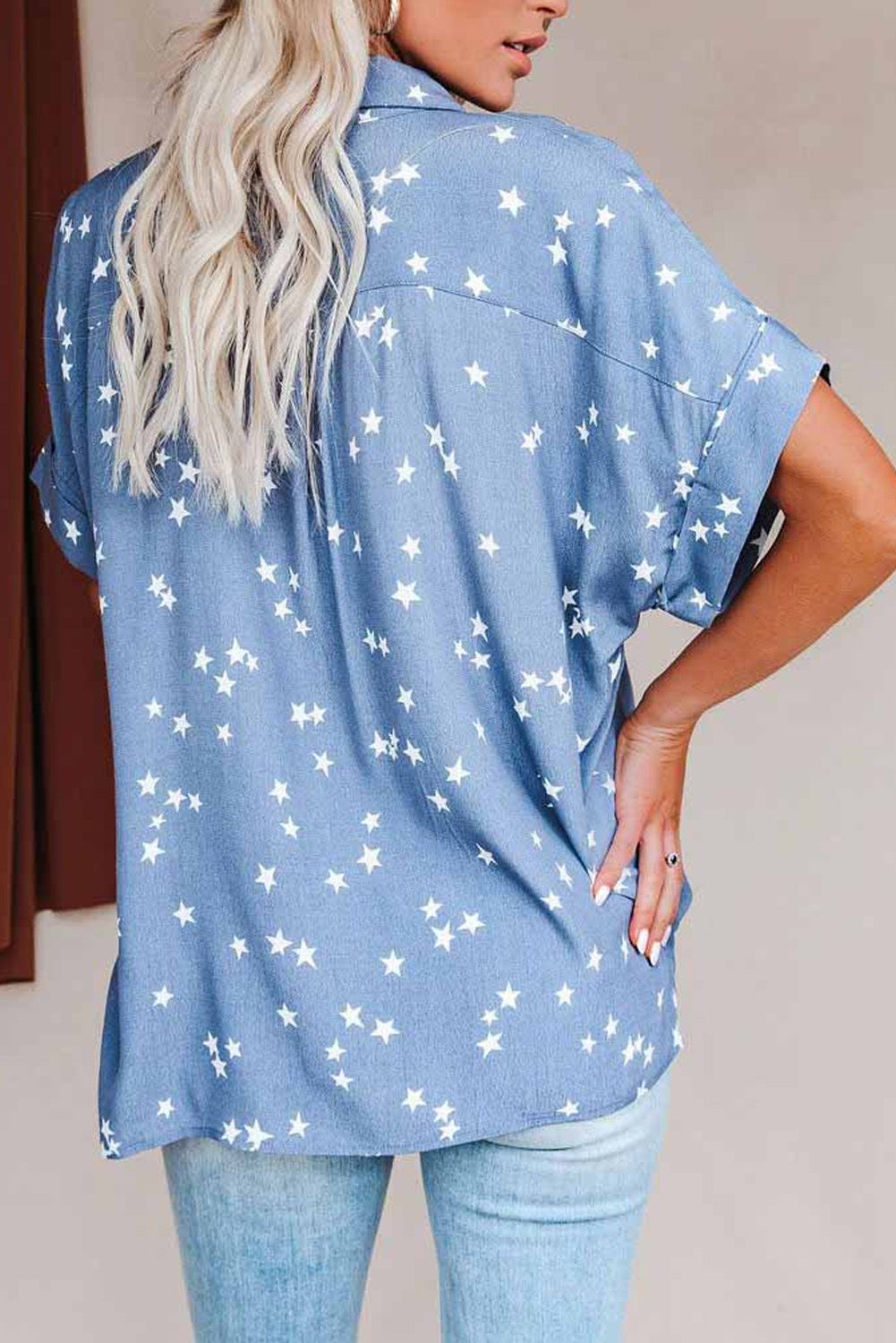 It features chic star print all over and a collar with sewn cuffed sleeves. Finished with front button closures and a bust pocket