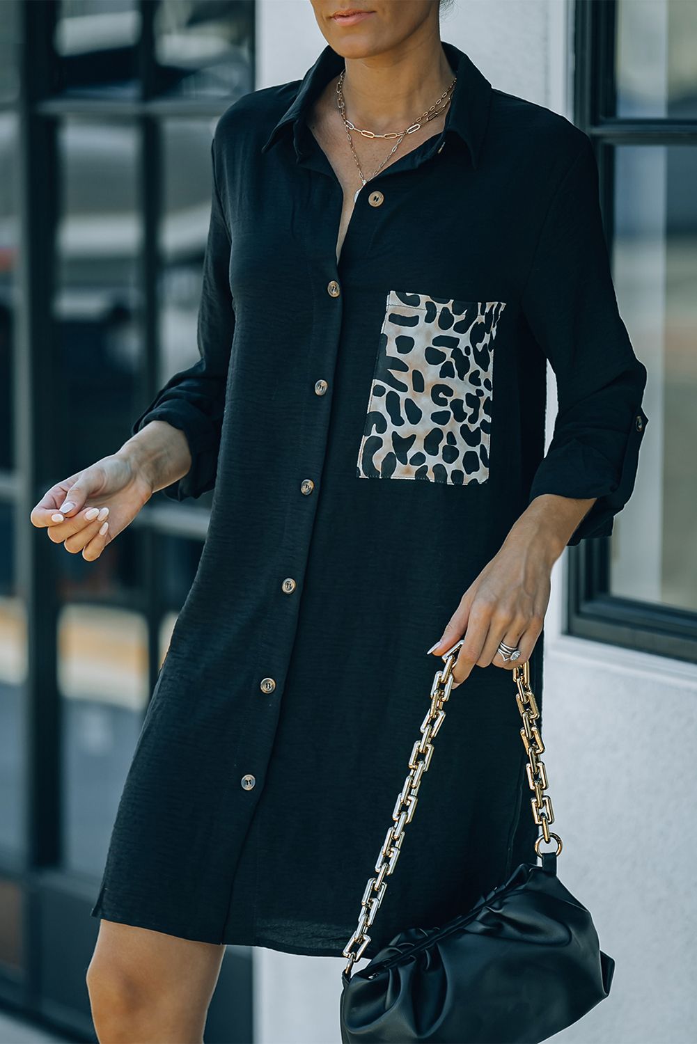 Black Cheetah Print Pocket Button Design Casual Shirt