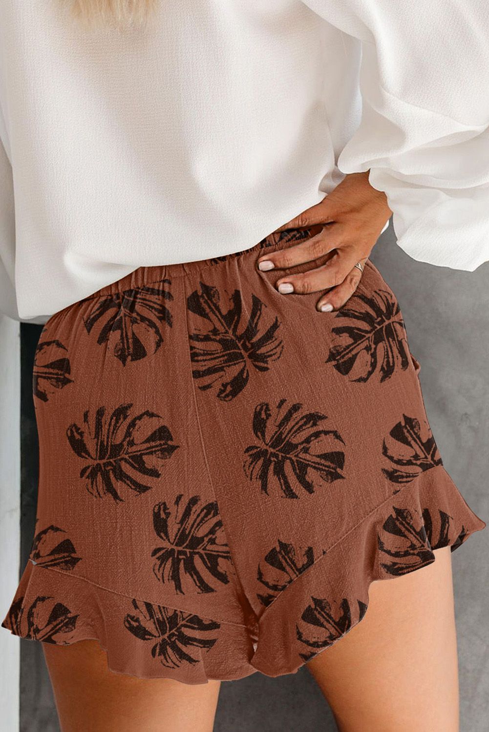 Black Palm Tree Leaves Print Elastic Waist Shorts with Pocket