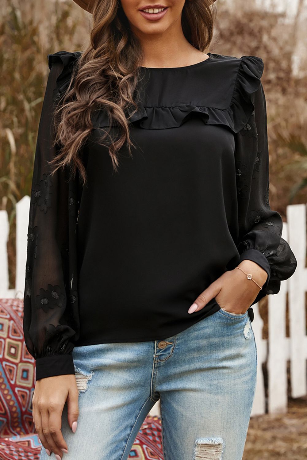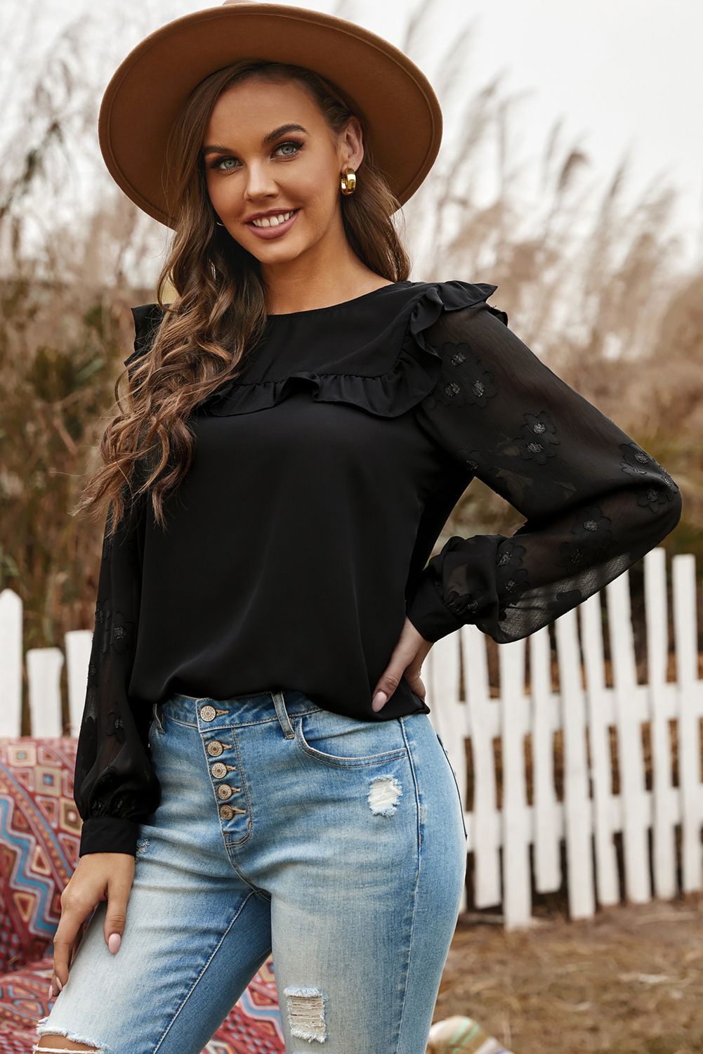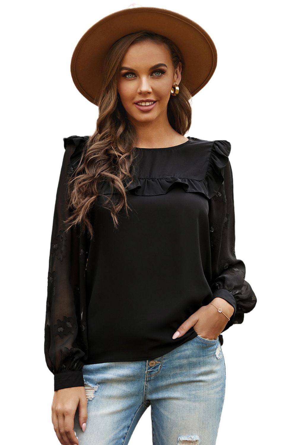 Our Contrast Sleeve Ruffle Blouse elevates with whimsical floral sheer sleeves